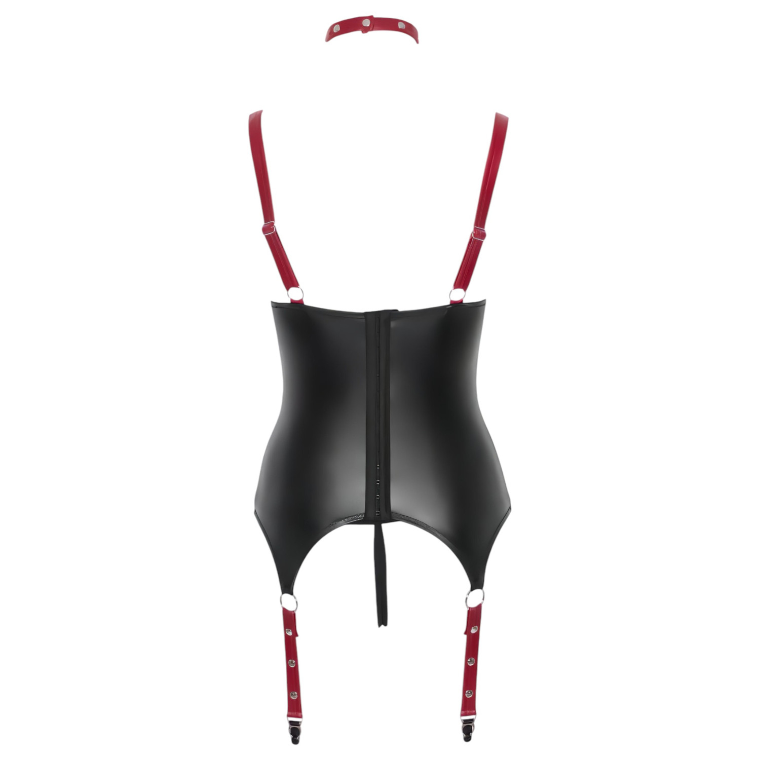 Zapeljivi rdeči trakovi, sijoč črn material in netasti dodatki - komplet spodnjega perila, ki popolno združuje zapeljevanje in dominanco.