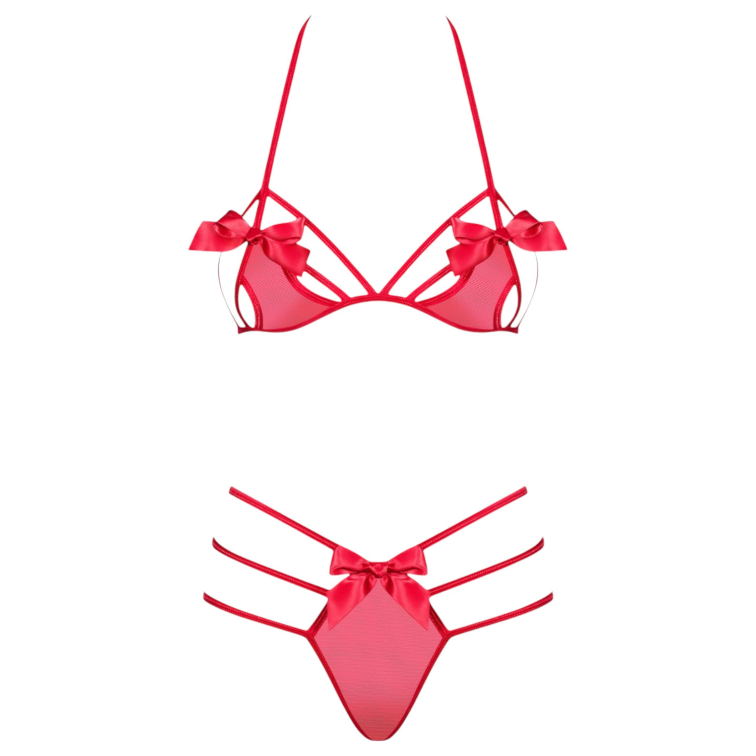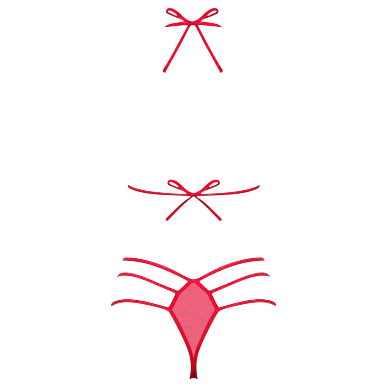 Obsessive Giftella komplet je zapeljiv in igriv komplet spodnjega perila iz mehke, prosojne raztegljive tkanine s trendovskim pasnim dizajnom in dekorativnimi pentljami.